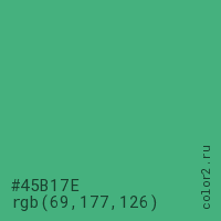 Цвет #45B17E в цветовой модели RGB обозначается тремя октетами (69, 177, 126) в десятичном формате и #45B17E в шестнадцатиричном (hex) формате, которые являются интенсивностью красного 69 (hex 45), интенсивность зелёного 177 (hex B1) и интенсивность синего 126 (hex 7E).