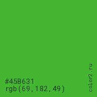 Цвет #45B631 в цветовой модели RGB обозначается тремя октетами (69, 182, 49) в десятичном формате и #45B631 в шестнадцатиричном (hex) формате, которые являются интенсивностью красного 69 (hex 45), интенсивность зелёного 182 (hex B6) и интенсивность синего 49 (hex 31).