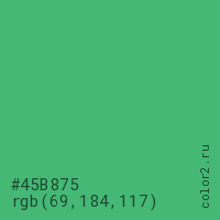 Цвет #45B875 в цветовой модели RGB обозначается тремя октетами (69, 184, 117) в десятичном формате и #45B875 в шестнадцатиричном (hex) формате, которые являются интенсивностью красного 69 (hex 45), интенсивность зелёного 184 (hex B8) и интенсивность синего 117 (hex 75).