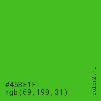 Цвет #45BE1F в цветовой модели RGB обозначается тремя октетами (69, 190, 31) в десятичном формате и #45BE1F в шестнадцатиричном (hex) формате, которые являются интенсивностью красного 69 (hex 45), интенсивность зелёного 190 (hex BE) и интенсивность синего 31 (hex 1F).