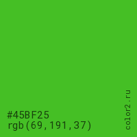 Цвет #45BF25 в цветовой модели RGB обозначается тремя октетами (69, 191, 37) в десятичном формате и #45BF25 в шестнадцатиричном (hex) формате, которые являются интенсивностью красного 69 (hex 45), интенсивность зелёного 191 (hex BF) и интенсивность синего 37 (hex 25).