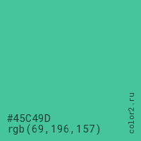 Цвет #45C49D в цветовой модели RGB обозначается тремя октетами (69, 196, 157) в десятичном формате и #45C49D в шестнадцатиричном (hex) формате, которые являются интенсивностью красного 69 (hex 45), интенсивность зелёного 196 (hex C4) и интенсивность синего 157 (hex 9D).