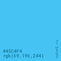 Цвет #45C4F4 в цветовой модели RGB обозначается тремя октетами (69, 196, 244) в десятичном формате и #45C4F4 в шестнадцатиричном (hex) формате, которые являются интенсивностью красного 69 (hex 45), интенсивность зелёного 196 (hex C4) и интенсивность синего 244 (hex F4).
