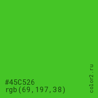 Цвет #45C526 в цветовой модели RGB обозначается тремя октетами (69, 197, 38) в десятичном формате и #45C526 в шестнадцатиричном (hex) формате, которые являются интенсивностью красного 69 (hex 45), интенсивность зелёного 197 (hex C5) и интенсивность синего 38 (hex 26).