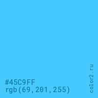 Цвет #45C9FF в цветовой модели RGB обозначается тремя октетами (69, 201, 255) в десятичном формате и #45C9FF в шестнадцатиричном (hex) формате, которые являются интенсивностью красного 69 (hex 45), интенсивность зелёного 201 (hex C9) и интенсивность синего 255 (hex FF).