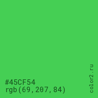 Цвет #45CF54 в цветовой модели RGB обозначается тремя октетами (69, 207, 84) в десятичном формате и #45CF54 в шестнадцатиричном (hex) формате, которые являются интенсивностью красного 69 (hex 45), интенсивность зелёного 207 (hex CF) и интенсивность синего 84 (hex 54).