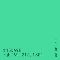 Цвет #45DA9E в цветовой модели RGB обозначается тремя октетами (69, 218, 158) в десятичном формате и #45DA9E в шестнадцатиричном (hex) формате, которые являются интенсивностью красного 69 (hex 45), интенсивность зелёного 218 (hex DA) и интенсивность синего 158 (hex 9E).
