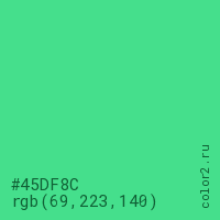 Цвет #45DF8C в цветовой модели RGB обозначается тремя октетами (69, 223, 140) в десятичном формате и #45DF8C в шестнадцатиричном (hex) формате, которые являются интенсивностью красного 69 (hex 45), интенсивность зелёного 223 (hex DF) и интенсивность синего 140 (hex 8C).