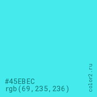 Цвет #45EBEC в цветовой модели RGB обозначается тремя октетами (69, 235, 236) в десятичном формате и #45EBEC в шестнадцатиричном (hex) формате, которые являются интенсивностью красного 69 (hex 45), интенсивность зелёного 235 (hex EB) и интенсивность синего 236 (hex EC).