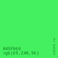 Цвет #45F060 в цветовой модели RGB обозначается тремя октетами (69, 240, 96) в десятичном формате и #45F060 в шестнадцатиричном (hex) формате, которые являются интенсивностью красного 69 (hex 45), интенсивность зелёного 240 (hex F0) и интенсивность синего 96 (hex 60).