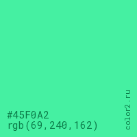 Цвет #45F0A2 в цветовой модели RGB обозначается тремя октетами (69, 240, 162) в десятичном формате и #45F0A2 в шестнадцатиричном (hex) формате, которые являются интенсивностью красного 69 (hex 45), интенсивность зелёного 240 (hex F0) и интенсивность синего 162 (hex A2).