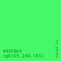 Цвет #45F869 в цветовой модели RGB обозначается тремя октетами (69, 248, 105) в десятичном формате и #45F869 в шестнадцатиричном (hex) формате, которые являются интенсивностью красного 69 (hex 45), интенсивность зелёного 248 (hex F8) и интенсивность синего 105 (hex 69).