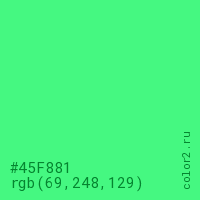 Цвет #45F881 в цветовой модели RGB обозначается тремя октетами (69, 248, 129) в десятичном формате и #45F881 в шестнадцатиричном (hex) формате, которые являются интенсивностью красного 69 (hex 45), интенсивность зелёного 248 (hex F8) и интенсивность синего 129 (hex 81).