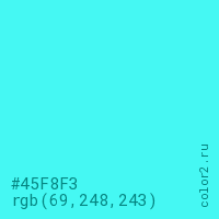 Цвет #45F8F3 в цветовой модели RGB обозначается тремя октетами (69, 248, 243) в десятичном формате и #45F8F3 в шестнадцатиричном (hex) формате, которые являются интенсивностью красного 69 (hex 45), интенсивность зелёного 248 (hex F8) и интенсивность синего 243 (hex F3).
