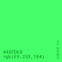 Цвет #45FD68 в цветовой модели RGB обозначается тремя октетами (69, 253, 104) в десятичном формате и #45FD68 в шестнадцатиричном (hex) формате, которые являются интенсивностью красного 69 (hex 45), интенсивность зелёного 253 (hex FD) и интенсивность синего 104 (hex 68).