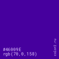 Цвет #46009E в цветовой модели RGB обозначается тремя октетами (70, 0, 158) в десятичном формате и #46009E в шестнадцатиричном (hex) формате, которые являются интенсивностью красного 70 (hex 46), интенсивность зелёного 0 (hex 00) и интенсивность синего 158 (hex 9E).