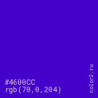 Цвет #4600CC в цветовой модели RGB обозначается тремя октетами (70, 0, 204) в десятичном формате и #4600CC в шестнадцатиричном (hex) формате, которые являются интенсивностью красного 70 (hex 46), интенсивность зелёного 0 (hex 00) и интенсивность синего 204 (hex CC).
