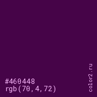 Цвет #460448 в цветовой модели RGB обозначается тремя октетами (70, 4, 72) в десятичном формате и #460448 в шестнадцатиричном (hex) формате, которые являются интенсивностью красного 70 (hex 46), интенсивность зелёного 4 (hex 04) и интенсивность синего 72 (hex 48).