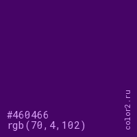 Цвет #460466 в цветовой модели RGB обозначается тремя октетами (70, 4, 102) в десятичном формате и #460466 в шестнадцатиричном (hex) формате, которые являются интенсивностью красного 70 (hex 46), интенсивность зелёного 4 (hex 04) и интенсивность синего 102 (hex 66).