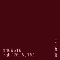 Цвет #460610 в цветовой модели RGB обозначается тремя октетами (70, 6, 16) в десятичном формате и #460610 в шестнадцатиричном (hex) формате, которые являются интенсивностью красного 70 (hex 46), интенсивность зелёного 6 (hex 06) и интенсивность синего 16 (hex 10).