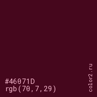 Цвет #46071D в цветовой модели RGB обозначается тремя октетами (70, 7, 29) в десятичном формате и #46071D в шестнадцатиричном (hex) формате, которые являются интенсивностью красного 70 (hex 46), интенсивность зелёного 7 (hex 07) и интенсивность синего 29 (hex 1D).