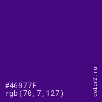 Цвет #46077F в цветовой модели RGB обозначается тремя октетами (70, 7, 127) в десятичном формате и #46077F в шестнадцатиричном (hex) формате, которые являются интенсивностью красного 70 (hex 46), интенсивность зелёного 7 (hex 07) и интенсивность синего 127 (hex 7F).
