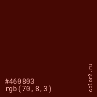 Цвет #460803 в цветовой модели RGB обозначается тремя октетами (70, 8, 3) в десятичном формате и #460803 в шестнадцатиричном (hex) формате, которые являются интенсивностью красного 70 (hex 46), интенсивность зелёного 8 (hex 08) и интенсивность синего 3 (hex 03).