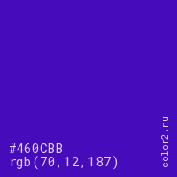 Цвет #460CBB в цветовой модели RGB обозначается тремя октетами (70, 12, 187) в десятичном формате и #460CBB в шестнадцатиричном (hex) формате, которые являются интенсивностью красного 70 (hex 46), интенсивность зелёного 12 (hex 0C) и интенсивность синего 187 (hex BB).