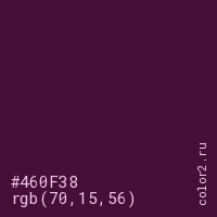 Цвет #460F38 в цветовой модели RGB обозначается тремя октетами (70, 15, 56) в десятичном формате и #460F38 в шестнадцатиричном (hex) формате, которые являются интенсивностью красного 70 (hex 46), интенсивность зелёного 15 (hex 0F) и интенсивность синего 56 (hex 38).