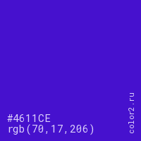Цвет #4611CE в цветовой модели RGB обозначается тремя октетами (70, 17, 206) в десятичном формате и #4611CE в шестнадцатиричном (hex) формате, которые являются интенсивностью красного 70 (hex 46), интенсивность зелёного 17 (hex 11) и интенсивность синего 206 (hex CE).