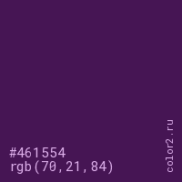 Цвет #461554 в цветовой модели RGB обозначается тремя октетами (70, 21, 84) в десятичном формате и #461554 в шестнадцатиричном (hex) формате, которые являются интенсивностью красного 70 (hex 46), интенсивность зелёного 21 (hex 15) и интенсивность синего 84 (hex 54).
