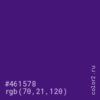 Цвет #461578 в цветовой модели RGB обозначается тремя октетами (70, 21, 120) в десятичном формате и #461578 в шестнадцатиричном (hex) формате, которые являются интенсивностью красного 70 (hex 46), интенсивность зелёного 21 (hex 15) и интенсивность синего 120 (hex 78).