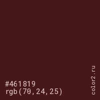 Цвет #461819 в цветовой модели RGB обозначается тремя октетами (70, 24, 25) в десятичном формате и #461819 в шестнадцатиричном (hex) формате, которые являются интенсивностью красного 70 (hex 46), интенсивность зелёного 24 (hex 18) и интенсивность синего 25 (hex 19).