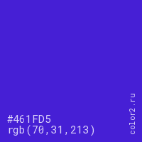 Цвет #461FD5 в цветовой модели RGB обозначается тремя октетами (70, 31, 213) в десятичном формате и #461FD5 в шестнадцатиричном (hex) формате, которые являются интенсивностью красного 70 (hex 46), интенсивность зелёного 31 (hex 1F) и интенсивность синего 213 (hex D5).