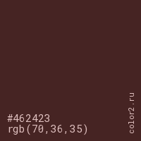 Цвет #462423 в цветовой модели RGB обозначается тремя октетами (70, 36, 35) в десятичном формате и #462423 в шестнадцатиричном (hex) формате, которые являются интенсивностью красного 70 (hex 46), интенсивность зелёного 36 (hex 24) и интенсивность синего 35 (hex 23).