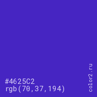 Цвет #4625C2 в цветовой модели RGB обозначается тремя октетами (70, 37, 194) в десятичном формате и #4625C2 в шестнадцатиричном (hex) формате, которые являются интенсивностью красного 70 (hex 46), интенсивность зелёного 37 (hex 25) и интенсивность синего 194 (hex C2).