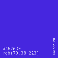 Цвет #4626DF в цветовой модели RGB обозначается тремя октетами (70, 38, 223) в десятичном формате и #4626DF в шестнадцатиричном (hex) формате, которые являются интенсивностью красного 70 (hex 46), интенсивность зелёного 38 (hex 26) и интенсивность синего 223 (hex DF).