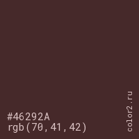 Цвет #46292A в цветовой модели RGB обозначается тремя октетами (70, 41, 42) в десятичном формате и #46292A в шестнадцатиричном (hex) формате, которые являются интенсивностью красного 70 (hex 46), интенсивность зелёного 41 (hex 29) и интенсивность синего 42 (hex 2A).