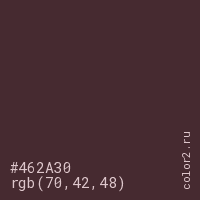 Цвет #462A30 в цветовой модели RGB обозначается тремя октетами (70, 42, 48) в десятичном формате и #462A30 в шестнадцатиричном (hex) формате, которые являются интенсивностью красного 70 (hex 46), интенсивность зелёного 42 (hex 2A) и интенсивность синего 48 (hex 30).