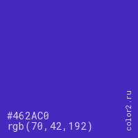 Цвет #462AC0 в цветовой модели RGB обозначается тремя октетами (70, 42, 192) в десятичном формате и #462AC0 в шестнадцатиричном (hex) формате, которые являются интенсивностью красного 70 (hex 46), интенсивность зелёного 42 (hex 2A) и интенсивность синего 192 (hex C0).