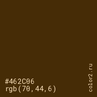 Цвет #462C06 в цветовой модели RGB обозначается тремя октетами (70, 44, 6) в десятичном формате и #462C06 в шестнадцатиричном (hex) формате, которые являются интенсивностью красного 70 (hex 46), интенсивность зелёного 44 (hex 2C) и интенсивность синего 6 (hex 06).