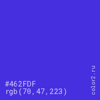 Цвет #462FDF в цветовой модели RGB обозначается тремя октетами (70, 47, 223) в десятичном формате и #462FDF в шестнадцатиричном (hex) формате, которые являются интенсивностью красного 70 (hex 46), интенсивность зелёного 47 (hex 2F) и интенсивность синего 223 (hex DF).