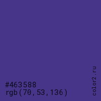 Цвет #463588 в цветовой модели RGB обозначается тремя октетами (70, 53, 136) в десятичном формате и #463588 в шестнадцатиричном (hex) формате, которые являются интенсивностью красного 70 (hex 46), интенсивность зелёного 53 (hex 35) и интенсивность синего 136 (hex 88).