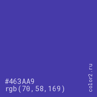Цвет #463AA9 в цветовой модели RGB обозначается тремя октетами (70, 58, 169) в десятичном формате и #463AA9 в шестнадцатиричном (hex) формате, которые являются интенсивностью красного 70 (hex 46), интенсивность зелёного 58 (hex 3A) и интенсивность синего 169 (hex A9).