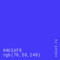 Цвет #463AF8 в цветовой модели RGB обозначается тремя октетами (70, 58, 248) в десятичном формате и #463AF8 в шестнадцатиричном (hex) формате, которые являются интенсивностью красного 70 (hex 46), интенсивность зелёного 58 (hex 3A) и интенсивность синего 248 (hex F8).