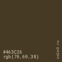 Цвет #463C26 в цветовой модели RGB обозначается тремя октетами (70, 60, 38) в десятичном формате и #463C26 в шестнадцатиричном (hex) формате, которые являются интенсивностью красного 70 (hex 46), интенсивность зелёного 60 (hex 3C) и интенсивность синего 38 (hex 26).