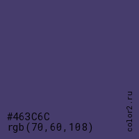 Цвет #463C6C в цветовой модели RGB обозначается тремя октетами (70, 60, 108) в десятичном формате и #463C6C в шестнадцатиричном (hex) формате, которые являются интенсивностью красного 70 (hex 46), интенсивность зелёного 60 (hex 3C) и интенсивность синего 108 (hex 6C).