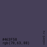 Цвет #463F58 в цветовой модели RGB обозначается тремя октетами (70, 63, 88) в десятичном формате и #463F58 в шестнадцатиричном (hex) формате, которые являются интенсивностью красного 70 (hex 46), интенсивность зелёного 63 (hex 3F) и интенсивность синего 88 (hex 58).