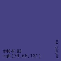 Цвет #464183 в цветовой модели RGB обозначается тремя октетами (70, 65, 131) в десятичном формате и #464183 в шестнадцатиричном (hex) формате, которые являются интенсивностью красного 70 (hex 46), интенсивность зелёного 65 (hex 41) и интенсивность синего 131 (hex 83).