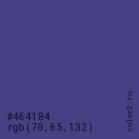 Цвет #464184 в цветовой модели RGB обозначается тремя октетами (70, 65, 132) в десятичном формате и #464184 в шестнадцатиричном (hex) формате, которые являются интенсивностью красного 70 (hex 46), интенсивность зелёного 65 (hex 41) и интенсивность синего 132 (hex 84).